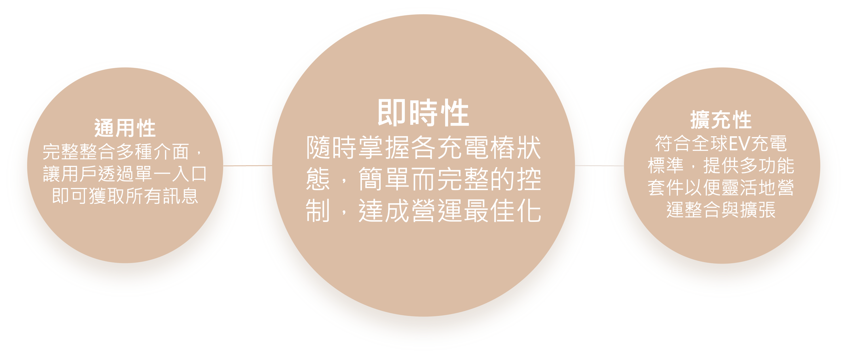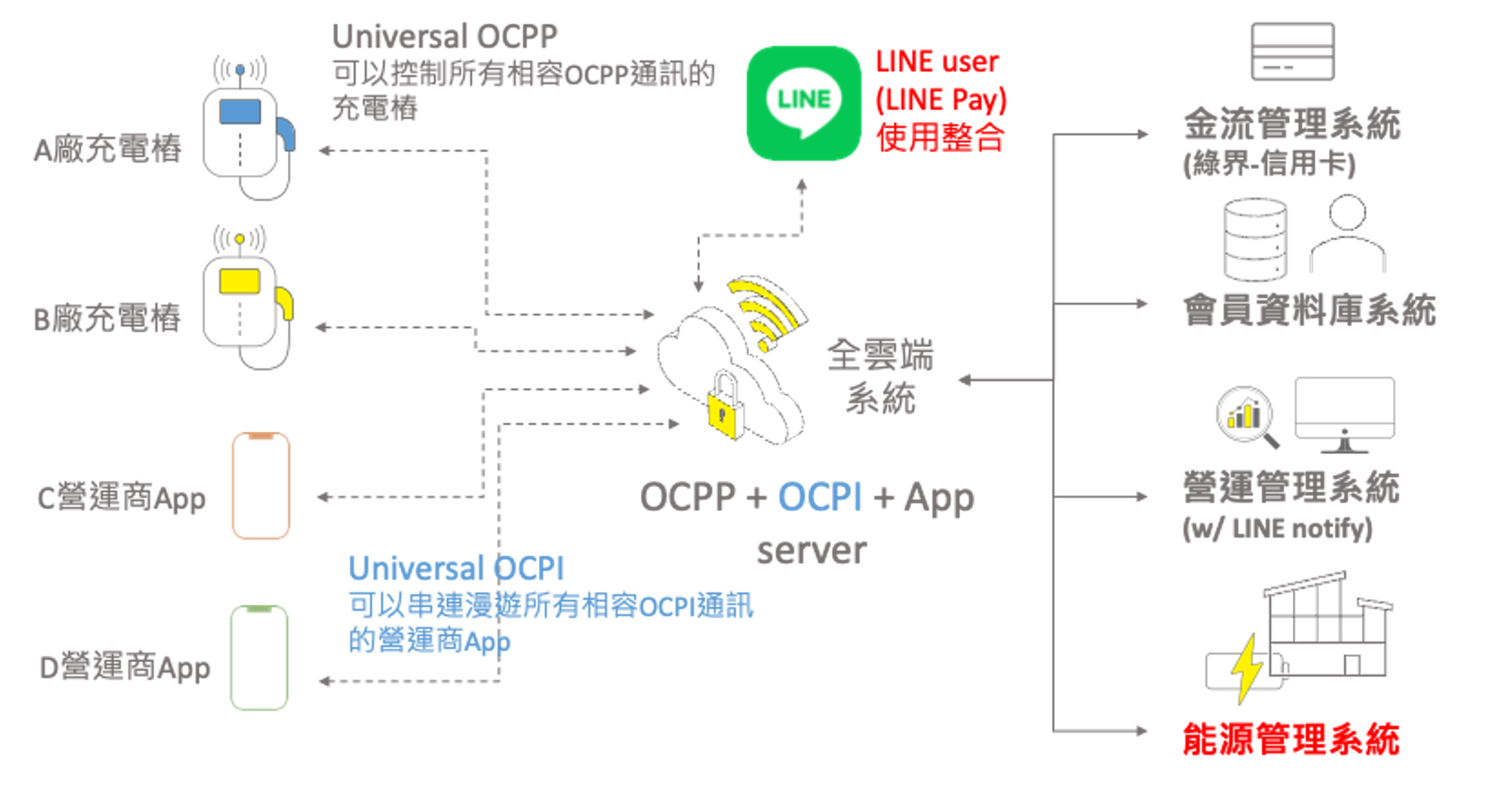 可控制所有相容OCPP通訊充電樁,可串接漫遊所有相容OCPI通訊營運商APP,所有服務皆整合至我們的全雲端系統